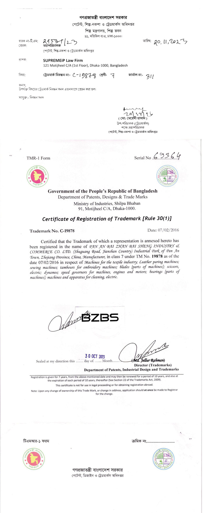 BZBS孟加拉商标发证通知-北京中天羽佳知识产权